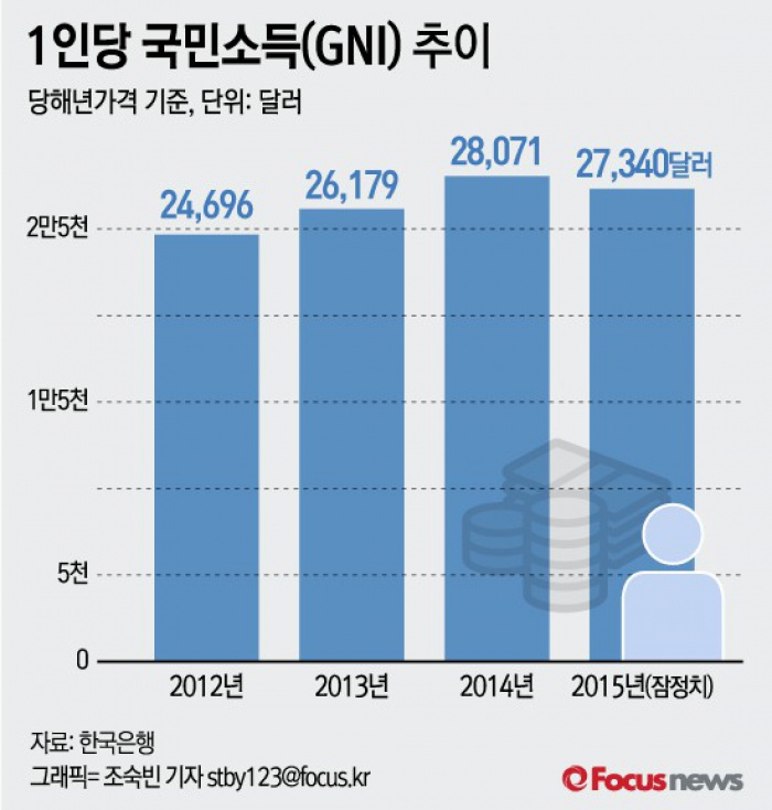 25일 한국은행이 발표한 '2014년 국민계정(확정) 및 2015년 국민계정(잠정)'에 따르면 지난해 우리나라 1인당 국민소득(GNI)은 전년(2만8071달러) 대비 2.6% 내린 2만7340달러(3093만5000원)로 나타났다. 이는 2009년 이후 6년만에 첫 감소세다.