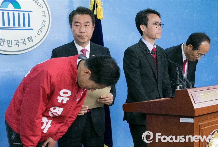 (서울=포커스뉴스) 김무성 새누리당 대표가 무공천을 선언한 지역구 후보들이 25일 오전 서울 여의도 국회 정론관에서 기자회견을 마친 뒤, 인사하고 있다. 왼쪽부터 유영하(서울 송파구을), 정종섭(대구 동구갑), 류재길(서울 은평구을), 추경호(대구 달성) 예비후보.
