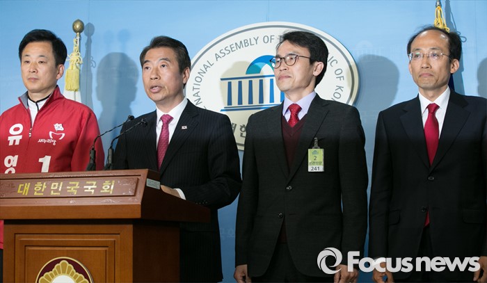 (서울=포커스뉴스) 김무성 새누리당 대표가 무공천을 선언한 지역구 후보들이 25일 오전 서울 여의도 국회 정론관에서 기자회견을 하고 있다. 왼쪽부터 유영하(서울 송파구을), 정종섭(대구 동구갑), 류재길(서울 은평구을), 추경호(대구 달성) 예비후보.