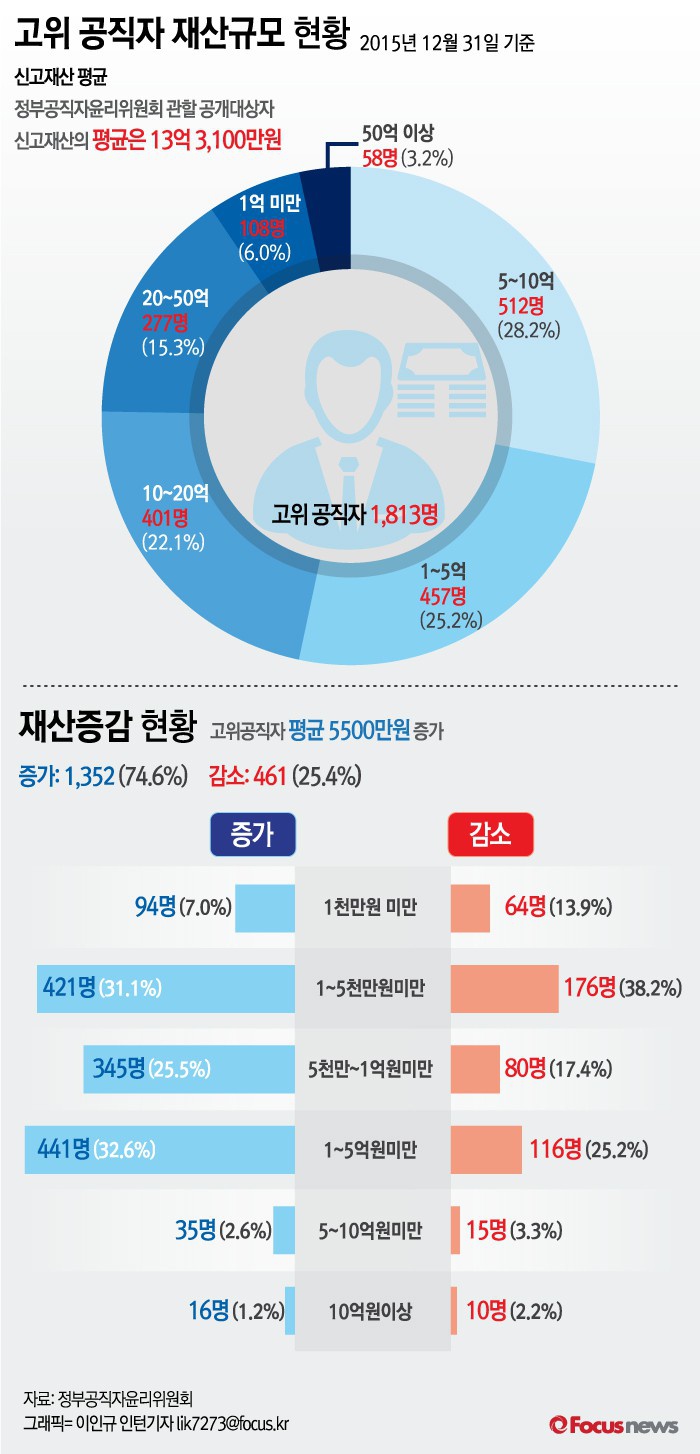 (서울=포커스뉴스) 25일 정부공직자윤리위원회이 발표한 자료에 따르면, 공개대상자 1,813명의 신고재산의 평균은 13억 3,100만원 이다.