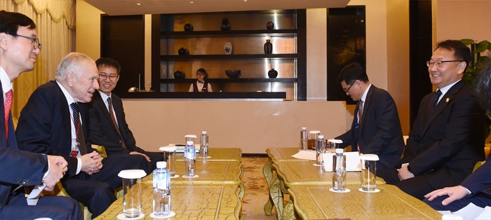 (서울=포커스뉴스) 2016년 보아오 포럼 연차총회 참석차 중국 하이난을 방문중인 유일호 부총리 겸 기획재정부 장관이 24일 BFA ICC에서 에드먼드 펠프스 컬럼비아대 교수와 면담을 갖고 있다. <사진제공=기획재정부>