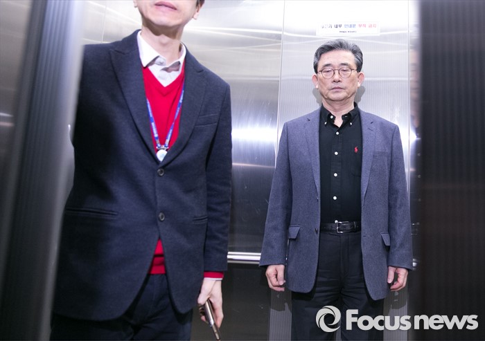 (서울=포커스뉴스) 김무성 새누리당 대표가 당 공천관리위원회의 결정에 반발해 유승민 의원 등 지역구 6곳에 대해 무공천을 선언해 갈등이 이어지고 있는 25일 오전 서울 여의도 당사로 이한구 공천관리위원장이 승강기에 올라 이동하고 있다.
