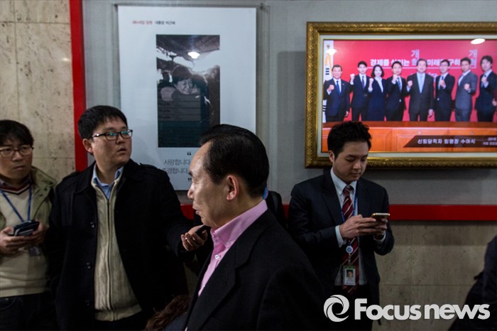 (서울=포커스뉴스) 이른바 진박 후보 공천장에 도장 못찍는다며 김무성 새누리당 대표의 '옥새투쟁'이 이어지고 있는 25일 오전 서울 영등포구 새누리당사 앞에서 이인재 새누리당 최고위원이 회의에 참석하기 위해 이동 하고 있다.