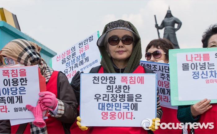 (서울=포커스뉴스) 25일 오전 서울 광화문광장에서 열린 천안함 6주기 추모 및 북한 규탄 기자회견에 참석한 엄마부대봉사단 회원들이 천안함 희생 장병들을 기리는 손팻말을 들고 있다.