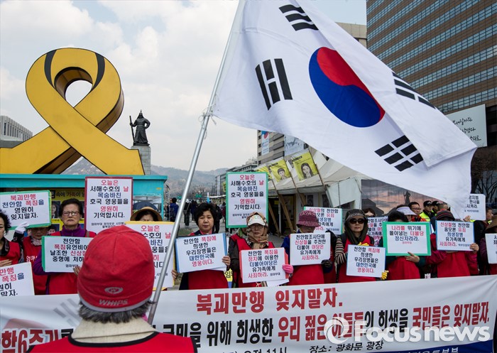 (서울=포커스뉴스) 25일 오전 서울 광화문광장에서 열린 천안함 6주기 추모 및 북한 규탄 기자회견에 참석한 엄마부대봉사단 회원들이 천안함 희생 장병들을 기리는 손팻말을 들고 있다.