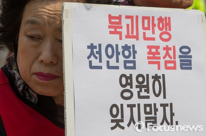 (서울=포커스뉴스) 25일 오전 서울 광화문광장에서 열린 천안함 6주기 추모 및 북한 규탄 기자회견에 참석한 엄마부대봉사단 회원들이 천안함 희생 장병들을 기리는 손팻말을 들고 있다.