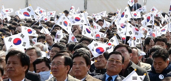 (서울=포커스뉴스) 25일 오전 국립대전현충원에서 열린 1회 서해수호의 날 기념식에 참석자들이 태극기를 흔들며 대합창을 하고 있다. <사진제공=국가보훈처>