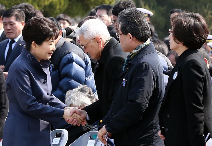 (서울=포커스뉴스) 박근혜 대통령이 25일 오전 국립대전현충원에서 열린 1회 서해수호의 날 기념식에 참석해 유족대표들과 인사하고 있다. <사진제공=국가보훈처>