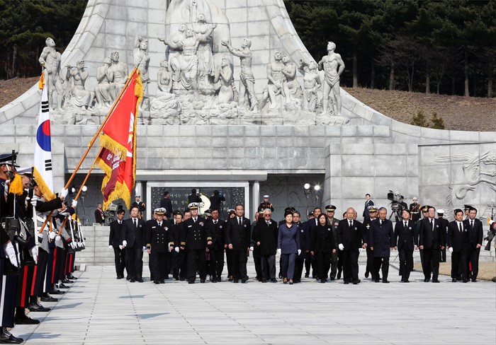 (서울=포커스뉴스) 박근혜 대통령이 25일 오전 국립대전현충원에서 열린 1회 서해수호의 날 기념식에 참석해 헌화 및 분향 후 현충탑을 나서고 있다. <사진제공=국가보훈처>