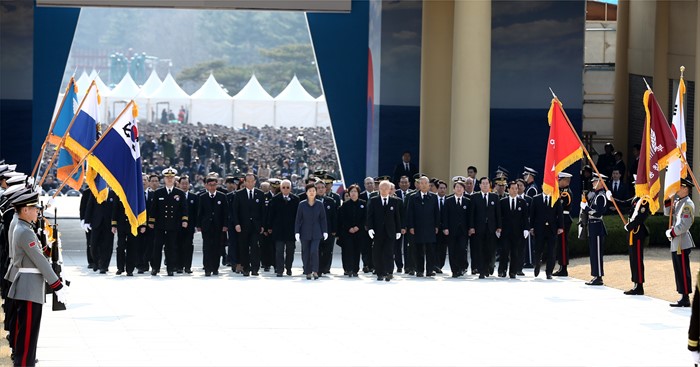 (서울=포커스뉴스) 박근혜 대통령이 25일 오전 국립대전현충원에서 열린 1회 서해수호의 날 기념식에 참석해 헌화 및 분향을 위해 현충탑으로 향하고 있다. <사진제공=국가보훈처>