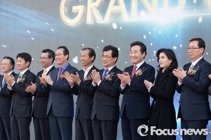 (서울=포커스뉴스) 25일 오전 서울 용산구 HDC신라면세점 그랜드 오픈식에서 이부진(오른쪽 두번째) 호텔신라 사장과 정몽규(왼쪽 두번째) 현대산업개발 회장을 비롯한 참석자들이 박수를 치고 있다. 왼쪽 다섯번째부터 최문순 강원도지사, 이시종 충북도지사, 이낙연 전남도지사.