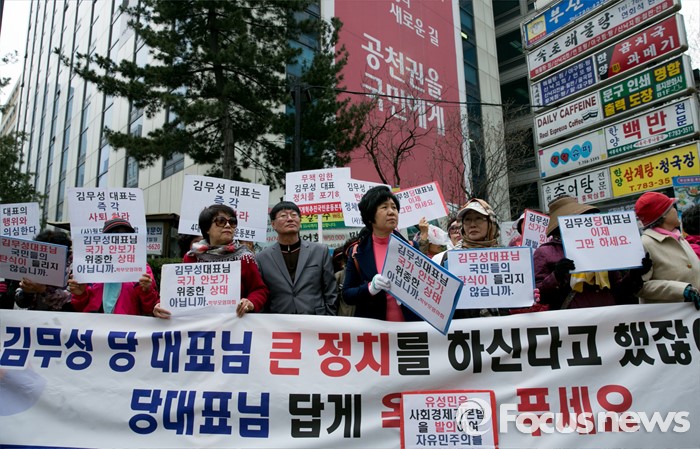 (서울=포커스뉴스) 김무성 새누리당 대표가 당 공천관리위원회의 결정에 반발해 유승민 의원 등 지역구 6곳에 대해 무공천을 선언해 갈등이 이어지고 있는 25일 오후 서울 여의도 당사 앞에서 김 대표의 결정에 반대하는 시민단체들이 집회를 하고 있다.