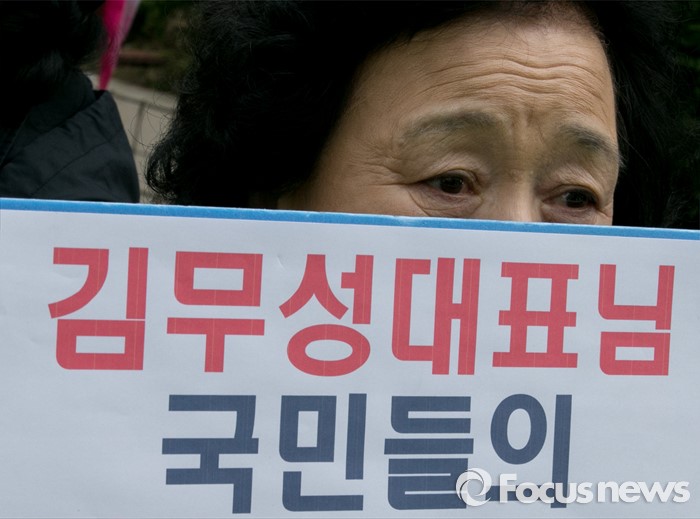 (서울=포커스뉴스) 김무성 새누리당 대표가 당 공천관리위원회의 결정에 반발해 유승민 의원 등 지역구 6곳에 대해 무공천을 선언해 갈등이 이어지고 있는 25일 오후 서울 여의도 당사 앞에서 김 대표의 결정에 반대하는 시민단체들이 집회를 하고 있다.