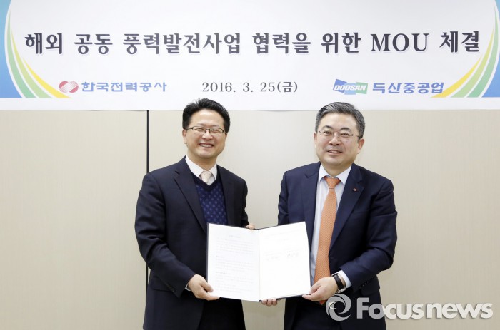 (서울=포커스뉴스) 두산중공업은 한국전력과 함께 해외 풍력발전 시장 공략에 나서기로 하고, ‘해외 풍력발전 사업에 대한 공동 개발, 건설과 운영 등 상호 협력을 위한 업무협약’을 체결했다고 25일 밝혔다.