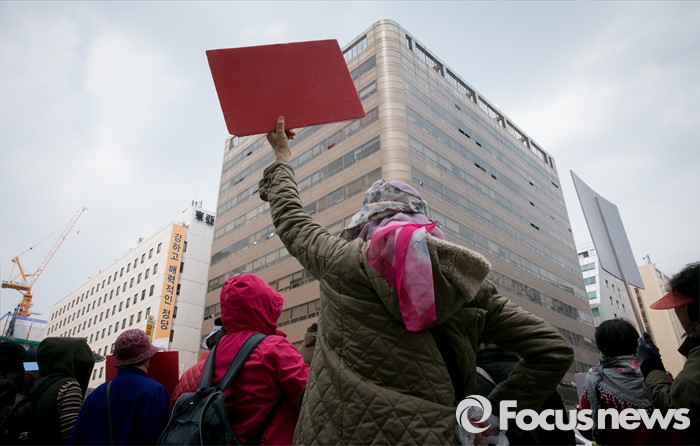 (서울=포커스뉴스) 김무성 새누리당 대표가 당 공천관리위원회의 결정에 반발해 유승민 의원 등 지역구 6곳에 대해 무공천을 선언해 갈등이 이어지고 있는 25일 오후 서울 여의도 당사 앞에서 김 대표의 결정에 반대하는 시민단체들이 집회를 하고 있다.