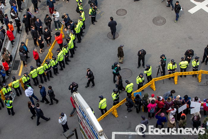 (서울=포커스뉴스) 새누리당이 최고위원회의를 열어 의결이 보류된 6개 지역구에 대한 추인 문제를 논의하고 있는 25일 오후 서울 영등포구 새누리당사 앞에서 '옥새투쟁'을 이어가고 있는 김무성 새누리당 대표의 행동을 규탄하는 당원과 옹호하는 당원들이 각자의 의견을 내세우고 있다.
