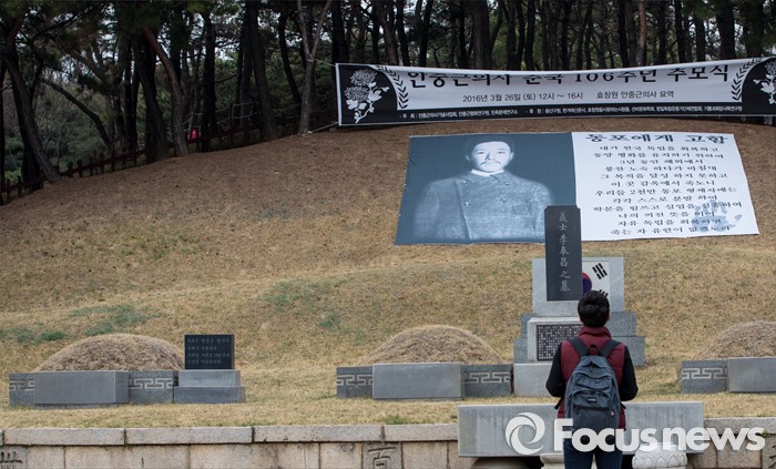 (서울=포커스뉴스) 안중근 의사 순국 106주기를 하루 앞둔 25일 오후 서울 용산구 효창공원 내 삼의사묘역에 마련된 안 의사 허묘 앞에서 한 시민이 현수막의 글귀를 읽고 있다.