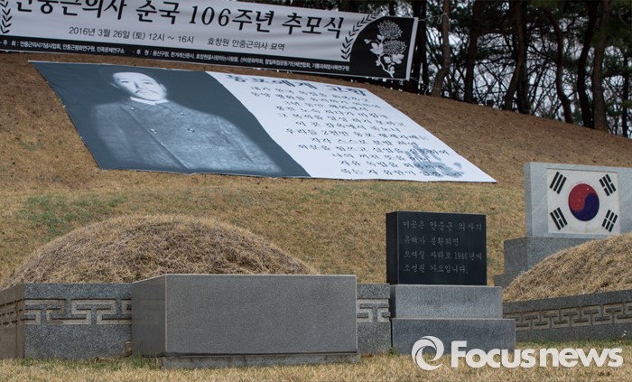 (서울=포커스뉴스) 안중근 의사 순국 106주기를 하루 앞둔 25일 오후 서울 용산구 효창공원 내 삼의사묘역에 마련된 안 의사 허묘 위로 추모식을 알리는 현수막과 안중근 의사의 사진이 걸려 있다.