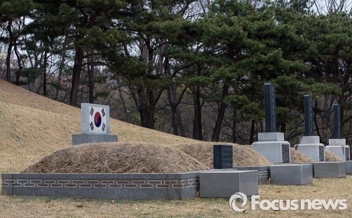 (서울=포커스뉴스) 안중근 의사 순국 106주기를 하루 앞둔 25일 오후 서울 용산구 효창공원 내 삼의사묘역에 마련된 안 의사 허묘. 옆으로 왼쪽 두 번째 부터 이봉창, 윤봉길, 백정기 의사의 묘.