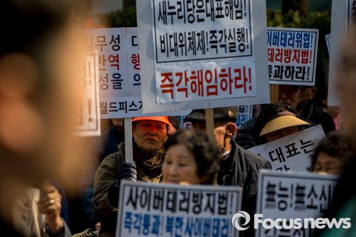 (서울=포커스뉴스) 새누리당이 최고위원회의를 열어 의결이 보류된 5개 지역구에 대한 추인 문제를 논의하고 있는 25일 오후 서울 영등포구 새누리당사 앞에서 어버이연합 관계자들이 '옥새투쟁'을 이어가고 있는 김무성 새누리당 대표의 행동을 규탄 하고 있다.