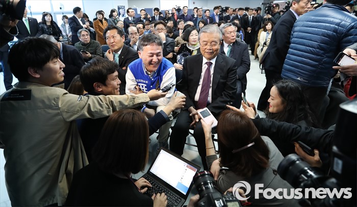 (용인=포커스뉴스) 김종인 더불어민주당 비대위 대표와 표창원 후보가 25일 오후 경기도 용인시 선거사무소 개소식에 참석해 취재진의 질문을 듣고 있다.
