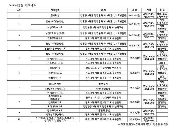 또 4월 1일 남산 1호터널(하행), 퇴계로지하차도, 서소문고가차도 △2일 월드컵 터널, 성산지하차도, 연희지하차도 △3일 남산2호터널, 남산2호입구 지하차도, 이태원 지하차도 △4일 증산지하차도(보도포함), 신사지하차토, 모래내 지하차도로 진행될 예정이다.