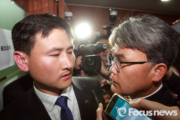 (서울=포커스뉴스) 이재만(오른쪽) 새누리당 대구 동을 예비후보가 25일 오후 서울 여의도 당사 회의장 입구에서 최고위원회의 무공천 결정에 대해 항의하며 면담을 요청하고 있다. 이날 새누리당 최고위는 정종섭(대구 동갑), 추경호(대구 달성), 이인선(대구 수성을) 후보의 공천을 확정했으며, 유영하(서울 송파을), 이재만(대구 동을), 유재길(서울 은평을) 후보는 공천 의결 보류를 확정했다.