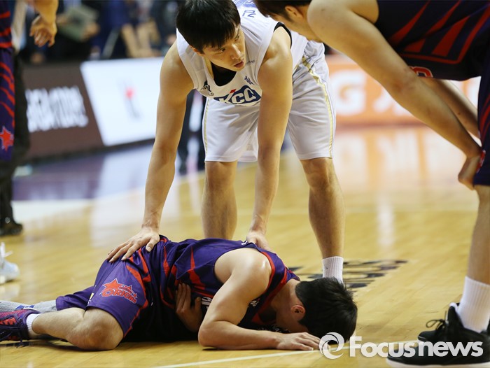 (고양=포커스뉴스) 25일 고양체육관에서 열린 2015-2016 프로농구 챔피언결정전 4차전 오리온-KCC경기에서 오리온 이현민이 경기중 충돌로 쓰러져 있다. KCC 김효범이 살펴 보고 있다.
