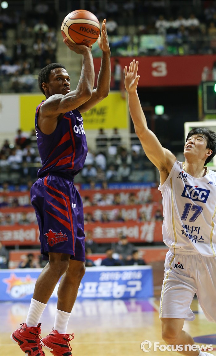 (고양=포커스뉴스) 25일 고양체육관에서 열린 2015-2016 프로농구 챔피언결정전 4차전 오리온-KCC경기에서 오리온 조 잭슨이 KCC 신명호의 마크에 앞서 미들슛을 쏘고 있다.
