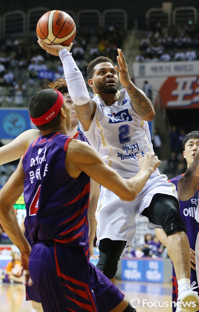(고양=포커스뉴스) 25일 고양체육관에서 열린 2015-2016 프로농구 챔피언결정전 4차전 오리온-KCC경기에서 KCC 에밋이 오리온 문태종의 수비 앞에서 원핸드 점프슛을 시도하고 있다.