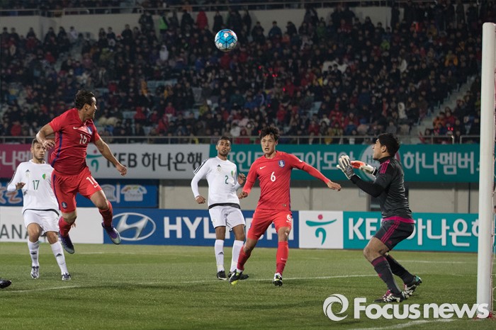 (이천=포커스뉴스) 25일 오후 경기 이천종합운동장에서 열린 KEB하나은행 초청 올림픽대표 대한민국과 알제리의 친선경기에서 전반전 한국 이찬동이 헤딩을 하고 있다.