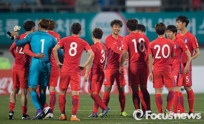 (이천=포커스뉴스) 25일 오후 경기 이천종합운동장에서 열린 KEB하나은행 초청 올림픽대표 대한민국과 알제리의 친선경기에서 2-0으로 승리한 선수들이 기뻐하고 있다.
