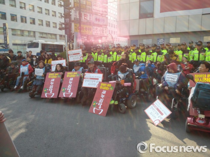 이들은 이날 오전 9시쯤 서울 여의도 새누리당사 앞에서 집회를 열고 "장애인권리보장법, 부양의무제, 장애인등급제를 폐지하라"면서 "권리 보장법은 동정의 시각으로 장애인에게 복지서비스 제공하는 게 아니라 장애인 정당한 권리를 보장하는 권리보장법을 제정하라는 것"이라고 밝혔다.