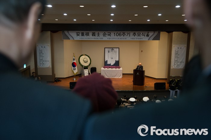 (서울=포커스뉴스) 26일 오전 서울 중구 안중근의사기념관에서 열린 '안중근의사 순국 106주기 추모식'에서 안응모 안중근의사숭모회 이사장이 추모식사를 하고 있다.