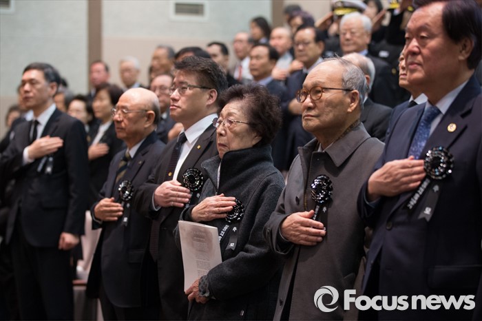 (서울=포커스뉴스) 26일 오전 서울 중구 안중근의사기념관에서 열린 '안중근의사 순국 106주기 추모식'에서 참석자들이 국기에 대한 경례를 하고 있다.