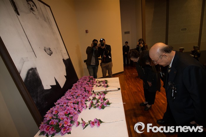 (서울=포커스뉴스) 26일 오전 서울 중구 안중근의사기념관에서 열린 '안중근의사 순국 106주기 추모식'에서 참석자들이 헌화 후 묵념을 하고 있다.