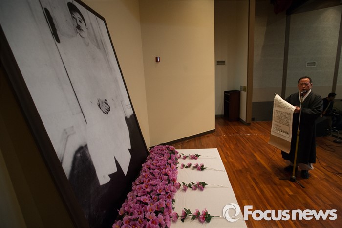 (서울=포커스뉴스) 26일 오전 서울 중구 안중근의사기념관에서 열린 '안중근의사 순국 106주기 추모식'에서 성재경 시인이 추모 헌시를 읽고 있다.