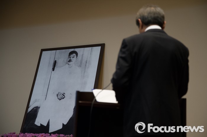 (서울=포커스뉴스) 26일 오전 서울 중구 안중근의사기념관에서 열린 '안중근의사 순국 106주기 추모식'에서 최창섭 제2기 안중근 홍보대사가 최후의 유언을 낭독하고 있다.