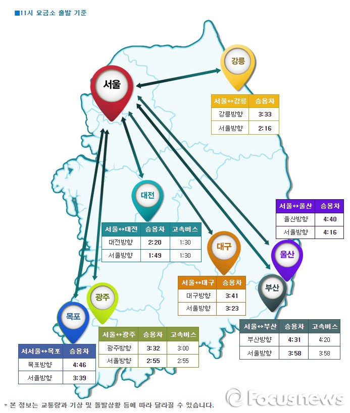 도로공사 관계자는 "서울·수도권에서 지방으로 차량 44만대가 빠져나가고 42만대가 들어올 예정"이라고 밝혔다.26일 오전 11시 기준 주요 도시 간 고속도로 소요시간. <사진제공=한국도로공사>