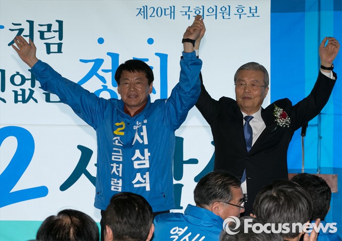 (무안=포커스뉴스) 26일 오후 전남 무안군에서 열린 서삼석 더불어민주당 전남 영암·무안·신안군 후보 선거사무소 개소식에 참석한 김종인(오른쪽) 비대위 대표와 서 후보가 손을 들어 인사하고 있다.