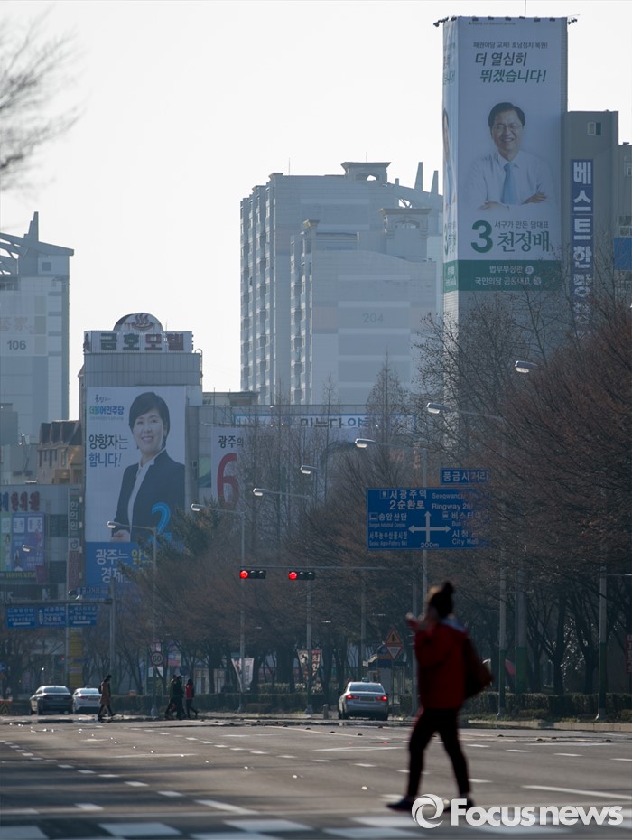 (광주=포커스뉴스) 야권의 호남쟁탈전이 벌어질 것으로 예상되는 20대 총선을 보름여 앞으로 다가온 26일 오후 광주 서구 풍금사거리에서 각 정당 후보들의 선거사무소 현수막이 보이고 있다.