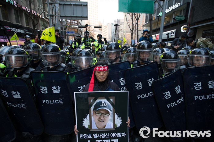 (서울=포커스뉴스) 26일 오후 서울 중구 무교동에서 '2016 총선투쟁 승리 범국민대회' 행진을 끝내고 유성기업 지회조합원들이 거리시위를 하고 있다. 유성기업 공대위는 故 한광호 조합원 죽음의 원인이 된 노조파괴를 중단하고 유성기업과 현대기아차의 처벌을 요구하고 있다.