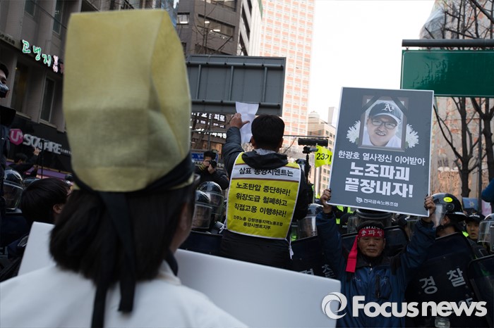 (서울=포커스뉴스) 26일 오후 서울 중구 무교동에서 '2016 총선투쟁 승리 범국민대회' 행진을 끝내고 유성기업 지회조합원들이 거리시위를 하고 있다. 유성기업 공대위는 故 한광호 조합원 죽음의 원인이 된 노조파괴를 중단하고 유성기업과 현대기아차의 처벌을 요구하고 있다.