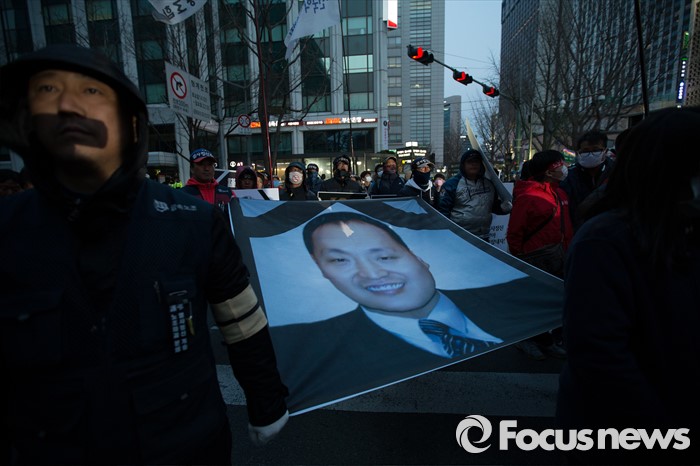 (서울=포커스뉴스) 26일 오후 서울 중구 무교동에서 '2016 총선투쟁 승리 범국민대회' 행진을 끝내고 유성기업 지회조합원들이 거리행진을 시청으로 향하고 있다. 유성기업 공대위는 故 한광호 조합원 죽음의 원인이 된 노조파괴를 중단하고 유성기업과 현대기아차의 처벌을 요구하고 있다.
