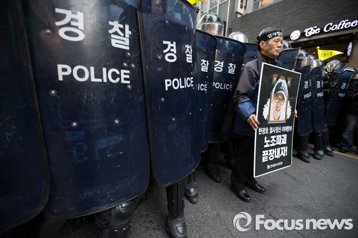 (서울=포커스뉴스) 26일 오후 서울 중구 무교동에서 '2016 총선투쟁 승리 범국민대회' 행진을 끝내고 유성기업 지회조합원들이 거리시위를 하고 있다. 유성기업 공대위는 故 한광호 조합원 죽음의 원인이 된 노조파괴를 중단하고 유성기업과 현대기아차의 처벌을 요구하고 있다.