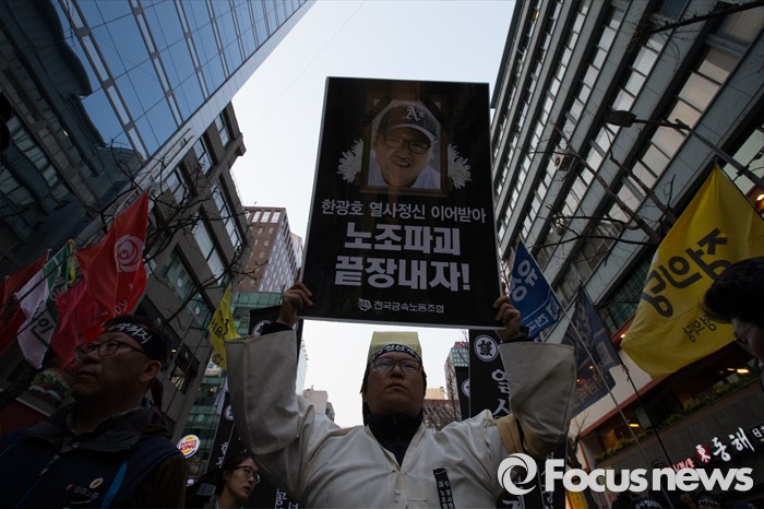 (서울=포커스뉴스) 26일 오후 서울 중구 무교동에서 '2016 총선투쟁 승리 범국민대회' 행진을 끝내고 유성기업 지회조합원들이 거리시위를 하고 있다. 유성기업 공대위는 故 한광호 조합원 죽음의 원인이 된 노조파괴를 중단하고 유성기업과 현대기아차의 처벌을 요구하고 있다.