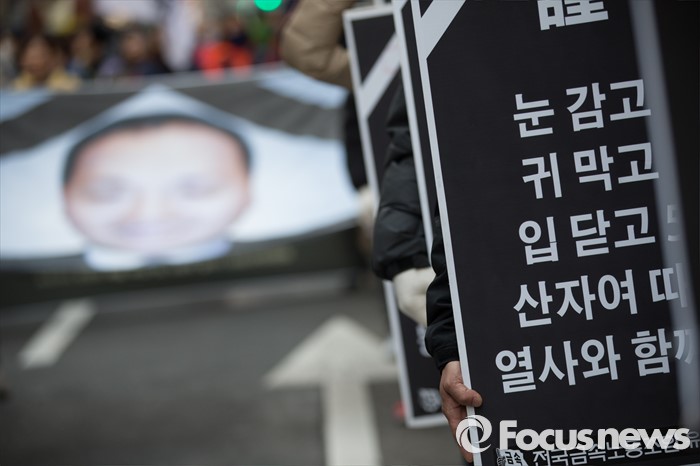 (서울=포커스뉴스) 26일 오후 서울 중구 무교동에서 '2016 총선투쟁 승리 범국민대회' 행진을 끝내고 유성기업 지회조합원들이 거리시위를 하고 있다. 유성기업 공대위는 故 한광호 조합원 죽음의 원인이 된 노조파괴를 중단하고 유성기업과 현대기아차의 처벌을 요구하고 있다.