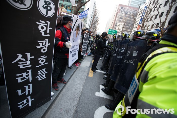(서울=포커스뉴스) 26일 오후 서울 중구 무교동에서 '2016 총선투쟁 승리 범국민대회' 행진을 끝내고 유성기업 지회조합원들이 거리시위를 하고 있다. 유성기업 공대위는 故 한광호 조합원 죽음의 원인이 된 노조파괴를 중단하고 유성기업과 현대기아차의 처벌을 요구하고 있다.