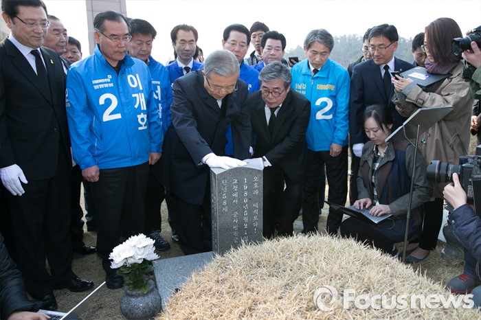 (광주=포커스뉴스) 김종인 더불어민주당 비대위 대표가 20대 총선 전남 및 광주지역 후보들과 함께 27일 오전 광주 북구 국립5·18민주묘지를 방문해 장방환 열사의 묘비를 만지고 있다.