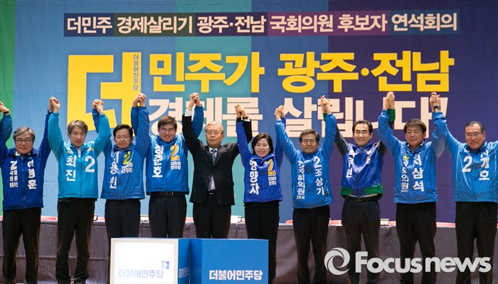 (광주=포커스뉴스) 김종인 더불어민주당 비대위 대표가 27일 오전 광주 서구 김대중컨벤션센터에서 열린 더불어민주당 경제살리기 광주·전남 20대 총선 후보자 연석회의에 참석해 후보자들과 함께 손을 들어 포즈를 취하고 있다.